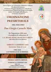 Sabato 3 gennaio 2026 – Santissimo nome di Gesù- alle ore 10.00 presso la Cattedrale di Acerenza, per l’imposizione delle mani e la preghiera consacratoria di S.E. Mons. Francesco Sirufo, sarà ordinato Presbitero il diacono: Don Giorgio Carmelo Maio.