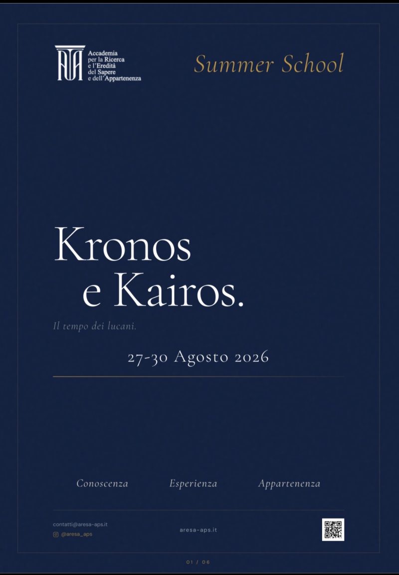 La Summer School 2026 si propone come uno spazio di alta formazione, confronto e ricerca dedicato ai giovani lucani tra i 18 e i 26 anni, che desiderano approfondire, con approccio interdisciplinare, il rapporto tra sapere, territorio e comunità. Il tema scelto, “Kronos e Kairos. Il tempo dei lucani”, offre una chiave di lettura particolarmente feconda per comprendere non solo il tempo nella sua dimensione quantitativa e lineare, ma anche il tempo come occasione, svolta, decisione, responsabilità storica e possibilità di significato. In questo senso, la Summer School intende porsi come luogo di studio e insieme di esperienza, in cui il sapere non resti astratto, ma si misuri con la realtà concreta della Basilicata e con le sue stratificazioni culturali, religiose e sociali.